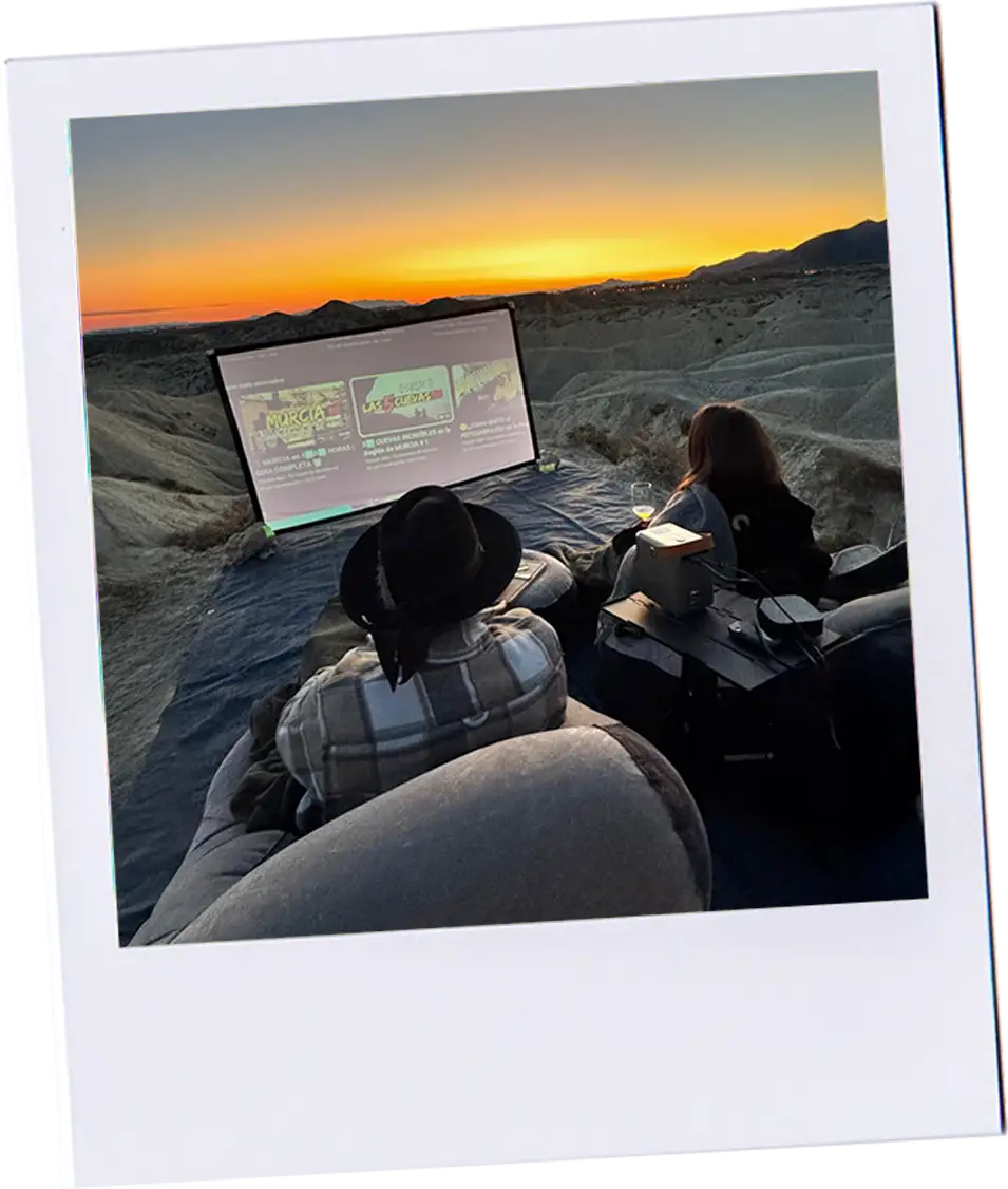 Ana, Antonio y Pemba Naturales de Murcia, Ana y Antonio redescubrieron su propia tierra con Ruta E — y con la fiel compañía de su labradora, Pemba. Vivieron una experiencia única de cine al aire libre en la región lunar de Murcia, con todo el confort que solo Ruta E puede ofrecer.
